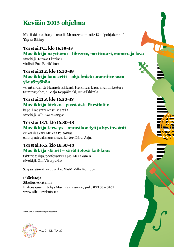 Tunne orkesterisi jatkaa kauden 2012–13 teemasarjaansa, jossa on pohdittu mitä moninaisempia ilmiöitä musiikin ympäriltä. Aivotutkimuksen, tanssin, arkkitehtuurin, näyttämökuvien ja näyttämöteosten kautta Tunne orkesterisi suuntaa nyt helmikuussa takaisin konserttimusiikin pariin, tällä kertaa niin kutstutun yleisötyön kautta: sinfoniaorkesterit ovat yhä kiinnostuneempia yleisöstään, ja angloamerikkalaisesta maailmasta alunperin liikkeelle lähtenyt audience development -buumi leviää ympäri maailman. Musiikkitalossakin yleisötyötä on tehty jo sangen ahkerasti, esimerkkeinä Kuule, minä sävellän! -yhteistyöhanke ja Helsingin kaupunginorkesterin kummilapsiprojekti, sekä tietenkin Tunne orkesterisi -luentosarja. Tunne orkesterisi -luennolla 21.2.2013 pohditaan myös yleisötyön, konserttien ja ohjelmistosuunnittelun yhteyksiä ja sitä, kuinka nämä toisiinsa vaikuttavat. Luennolla ovat vieraina Helsingin kaupunginorkesterin vt. indendentti Hannele Eklund sekä Musiikkitalon toimitusjohtaja Katja Leppäkoski. Luento on tuttuun tapaan Harjoitussali Paavossa klo 16.30–18.00.